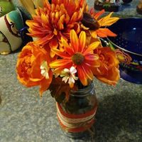 I just threw this together quickly !! My wedding is September 8 so I am going with fall colors and sunflowers. My mom had these quart size Mason jars so we put the orange burlap and lace and twine on...