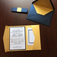 We have finally decided what the invites will look like. The design on the invite is still for discussion but something like the sample that was sent by Paperandmore. DIY with metallic dark blue, gold...