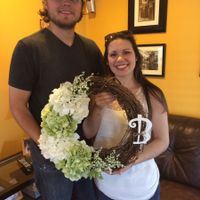 FH and I are still partying with our family and friends, but here's a pic of us and the awesome wreath my FSIL made us. Omg, so cute! We had such an amazing time, I can't wait to update y'all all...