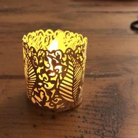 Our tea lights arrived from Amazon today! We decided to go with a wrap rather than a true voltives because it was so much less expensive. It looks great except.... the tea lights “flame” is a bit...