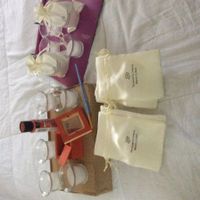 Finishing up some last minute things: wedding favor gifts and my keepsake box. Painted the box myself and placing the candles in the bags