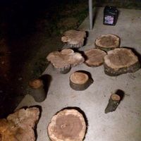 I'm so excited! I came home from work yesterday and FH had cut up all of the wood we had been gathering for wedding decorations. Here are the slabs that we will be using for our cake/cupcake stands...
