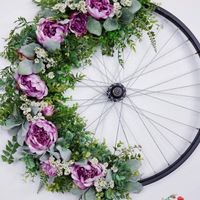 My FH is a huge bicyclist and I wanted to add a little touch of that at the wedding. I found someone selling a lovely painted bicycle rim and I want to add flowers to it so it looks something like...