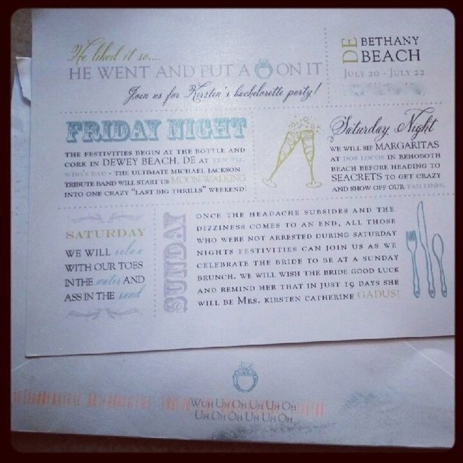 my sis created these for my bachelorette party I LOVE THEM!! & I can not wait They say... He liked it so he put a (pick of ring) on it join us for kirsts bachelorette party! DE Bethany Beach July 20 - july 22 FRiday night the festivities begin at the...