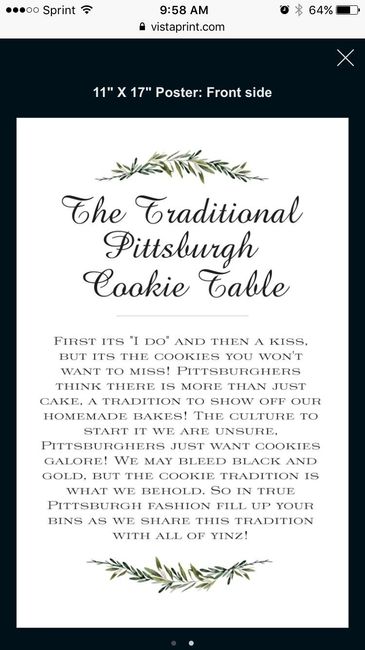 I'm originally from PA and in the last few years relocated to NE FL, met my FH, landed my dream job and we bought our first home! We're getting married in January 2019 in a very romantic, winter ceremony (as winter as FL can get) and you can bet we will be having a Pittsburgh cookie table!