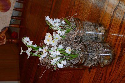 So I just recently found out that my grandmother has a ton of mason jars I can use, so I think I'm gonna switch out my vases that I would have to buy for free mason jars Here is what I put together last night. How do you think it looks? I'm going...