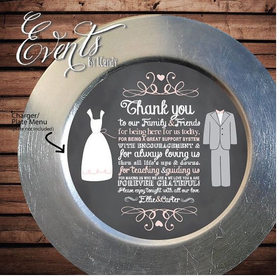 While looking on Etsy for a cake topper I ran across these charger inserts pictured below. I have NEVER seen these before. They are affordable to buy at $1/each, but would also be an easy DIY. They do menus, general couple photos and guest Thank You...