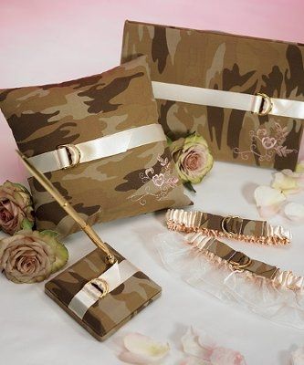 My fiance is a big hunter, so we decided to have a camo wedding! The guys are wearing black tux's with camo vest and ties. The girls are wearing an olivine green, my maid of honor is wearing a cocoa brown. I am having a big issue with finding the...