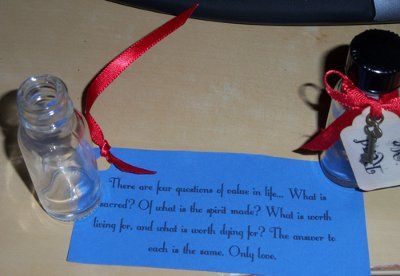 I am so happy with the way favors for my Alice in Wonderland wedding turned out! The bottles are each filled with one of six quotes printed on blue or grey paper. What do you think? I will have paper rose pics tomorrow.