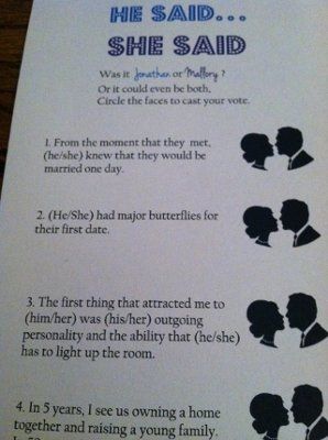 I saw this really cute thing on etsy, its alot like the ISPY game, theres a list of quotes, or funny things (habits,quirks)of the bride and groom, (like, who said "im going to marry you" on the first date? or who puts potato chips on everything?) and...