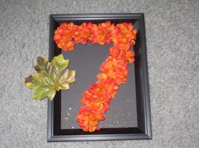 I made my own table numbers for the tables. I used black frames, black poster board sprayed with gold glitter, and orange/red mums. My colors are orange, red, and yellow, with mostly yellow and red in the centerpiece flowers, so this will show off...