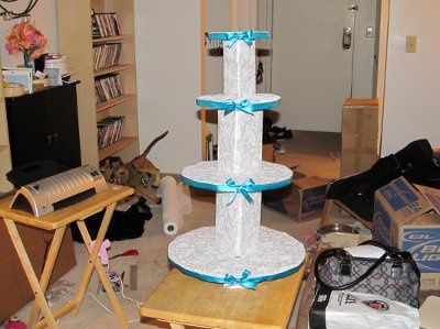 I just wanted to share this because I like it and I worked my butt off on it! I know it is leaning a bit to the right but I have since fixed that. The bottom three tiers will be filled with cake pops, the top with a small cake and our cake topper....