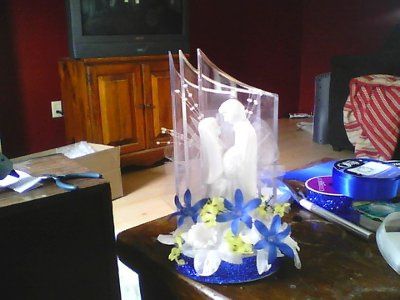 I bought the cake topper at a garage sale for two bucks. It was brand new still in box. It was too plain and whit for me. So stripped the ribbon on the bottom and added my own sparkle royal blue ribbon. I kept the white flowers on it already and...