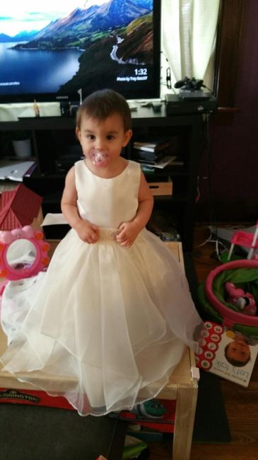 We were going to wait until after Easter to find a flower girl dress but my MOH (fg mom) found one on sale for $30 at Kohls. I added the "bling" to the ribbon around the waist and some stones to each little flower on the top last night. Super excited...