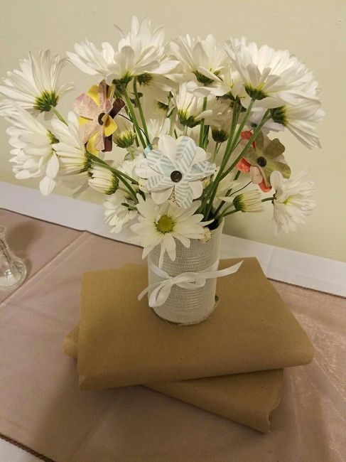 We did a mock up of our tables today. Our venue is an old Grange hall. So, we are going for a "Town Hall/ DIY style" theme. It is an afternoon, dessert only wedding. We have long tables. The flowers will be a bit different, they will have baby's...