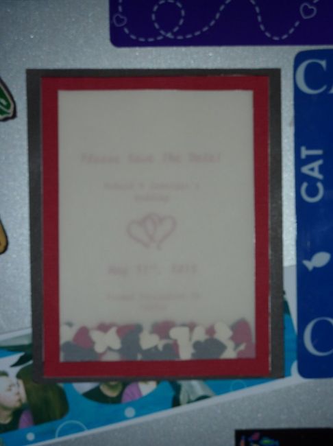 So tonight I tried my first DIY, Its our save the dates. It is looking like Ill need to change the font black instead or red, unless I can find clear transperancy paper. So what do you think?? Any suggestions? Tips? Im also thinking about making them...