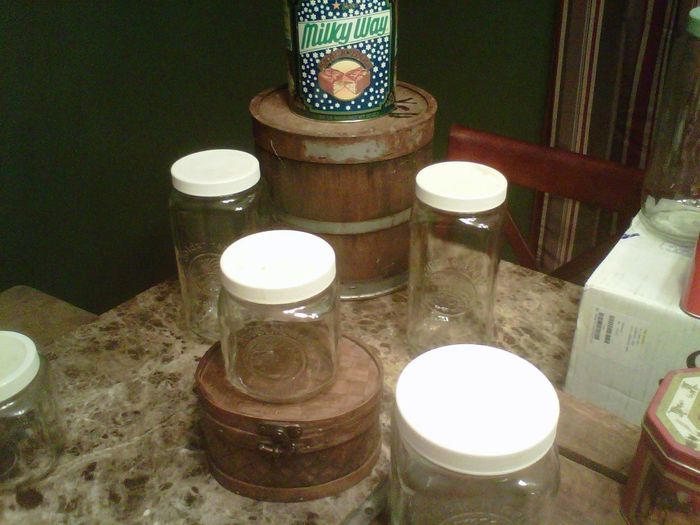 Ok ladies...I need some of your expertise. Here is some pics of my candy buffet mock up. Well, background is I am going for a rustic/antique type theme. I have a lot of mason jars (cliche I know). The candy jars are Mason canister jars. The tops...
