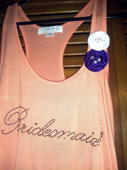 so I'm all about DIY... I'm trying to do as much as I can for my wedding..here are a few things I've done so far... plz share yours with the shirts I just bought the plain shirts and put the iron on letters...then made the flowers and put them on the...