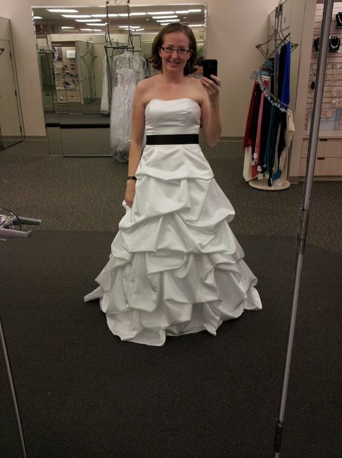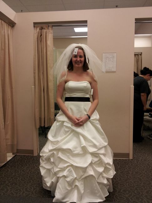 So i went to Davids Bridal and after three different trips and trying on probably 20 different dresses. I put this one on and feel in love, i was done trying on dresses. The sash looks black in the photo but it is actually a chocolate brown to match...