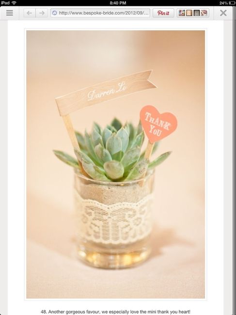 We just ordered everything we need to make our favors! We are using real succulents, that our guests can take home and plant, in little glass votives (it ties in with my bouquet and centerpieces). I'm pretty excited and I think it is unique, it will...