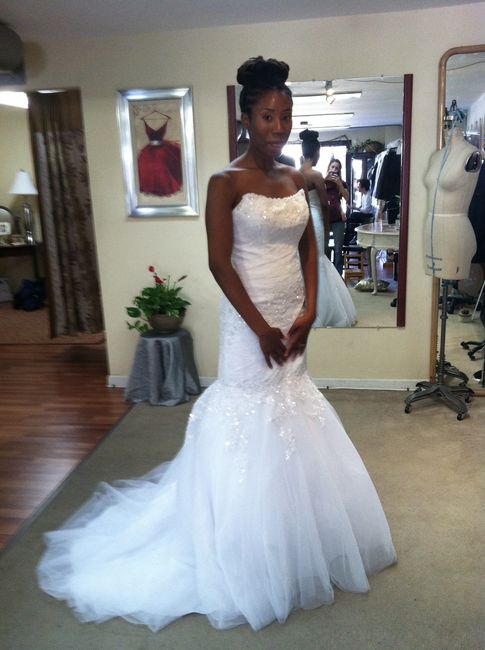 Here we go......just 2 weeks ago I finally settled on a dress for my BM's and MOH. I'd gone into David's Bridal and tried on the dress myself just to get a feel for it (see pics below) and to see how it'd look with the jewelry I picked. Was so in...