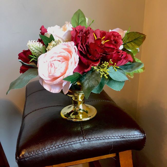 I was going to go with real everything but my cousins gave me her leftover floral and I had time to create centerpieces during quarantine. I bought some burgundy flowers and greenery. I still wanted real flowers for the wedding party and the bouquets...