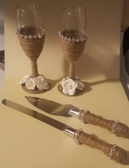 Just finished our toasting glasses and cake cutting set! Super pleased with how it turned out! It was super easy too. If anyones been thinking about doing their own go for it. Price breakdown Glasses - Both for $1 antique store Paper flowers- $3...