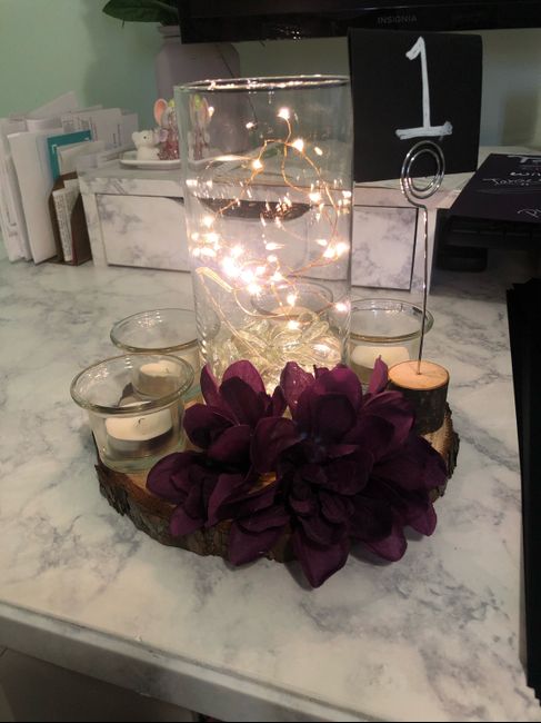 I finally figured out my centerpiece! I made this with some wooden slices (from an Etsy shop) and the flowers are from dollar tree! Table number will be hand written by me, and the holder is from amazon! The venue provides a complimentary...