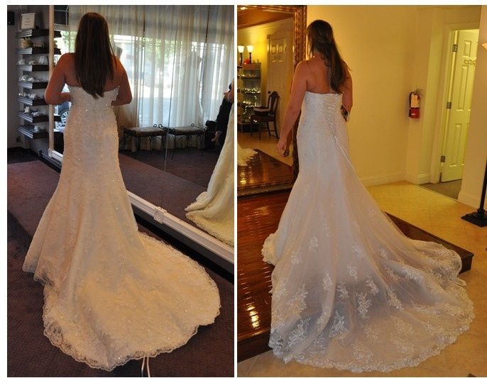 I absolutely LOVE the one dress on the left with all of the beading - but want to put in a corset back and have the train sheer like the one on the right. I am excited to have a unique dress without the custom price tag that would come along with it....