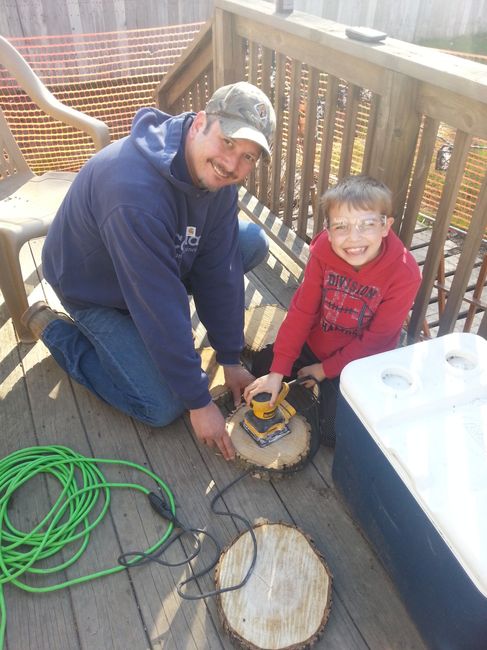 FH and my son are working on sanding and lacquering the wood slices for our centerpieces. Couldn't resist snapping a picture of them! What is everyone else's FH helping with for the wedding?