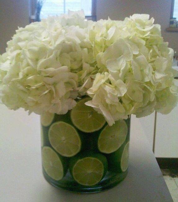 My plan for centerpieces is to use something like this picture, Hydrangeas in limes. But I've been made aware that their apparently is a lime shortage! Which is making limes (and Margaritas!) very expensive. My question, what could I use for the...