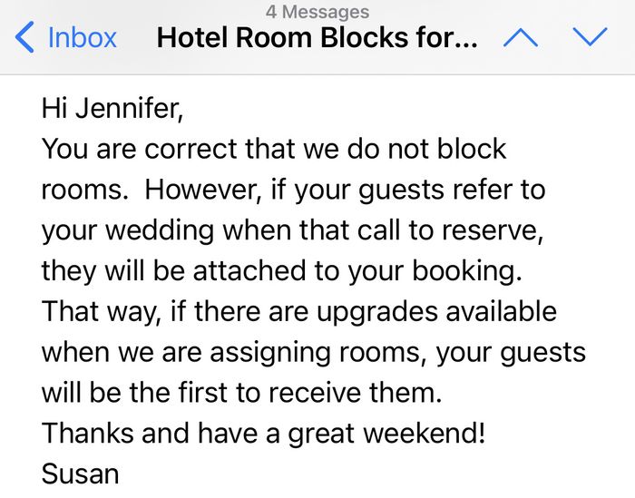 We are having our reception at the Crescent Hotel in Eureka Springs. However, the venue manager has informed me that they do not block hotel rooms for weddings. I do recommend that our guests stay at the Crescent Hotel for convenience, but I am not...