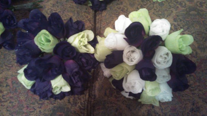 I made my bouquets tonight. I still need to finish the handles. My MoH thinks I should add some kind of jewels so that might happen, Sorry the picture quality isn't great.