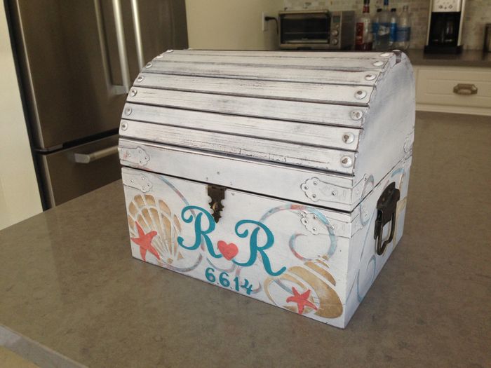 FH spent last night and part of this morning perfecting our card box...just have to add the latch/lock on front and remove one of the board from the top. This cost us about $25 to make and I LOVE it. Thank you Pinterest for the inspiration!
