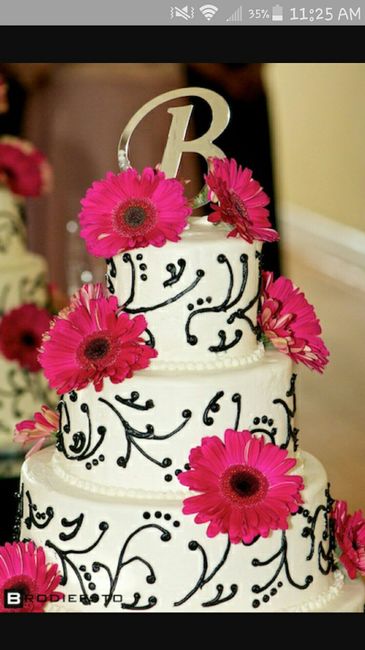 I found that I'm obsessed with looking at wedding cakes, so let's see your wedding cakes ladies! This is ours, our wedding is hot pink and black, and gerber daisies are our flowers. We are doing white cake and each tier will have a different filling,...