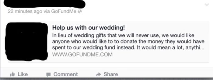A person from high school recently got engaged she immediately reached out to me to see how much I would charge to do her hair for the weekend. Then the next day she set up a gofundme account for her wedding " asking for donations in leu of gifts at...