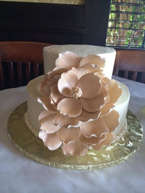 Hello fellow brides, My wedding's accent color is gold, and I reaaaaally want to have some gold on my cake. I'd planned to have some gold icing piped onto the cake, but my bakery (my family has gone there for years, so I'm not switching from this...