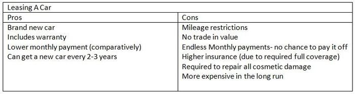 FH needs a new car. FFIL suggested we lease- as we use my car for traveling (good gas mileage and warranty) and FH's car will be used mainly for back and forth to work. I like the idea of a lower car payment and not the worry of having car issues...