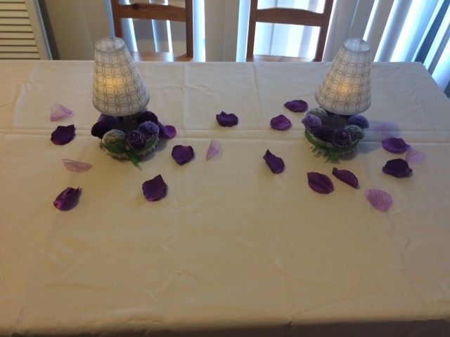 I did it! I covered 16 Styrofoam rings in ribbon, cut out over 4500 tissue paper circles (in stacks of 24 of course), wired them together, fluffed them into over 150 flowers, wrapped the stems in floral tape and then made them into centerpieces! I am...