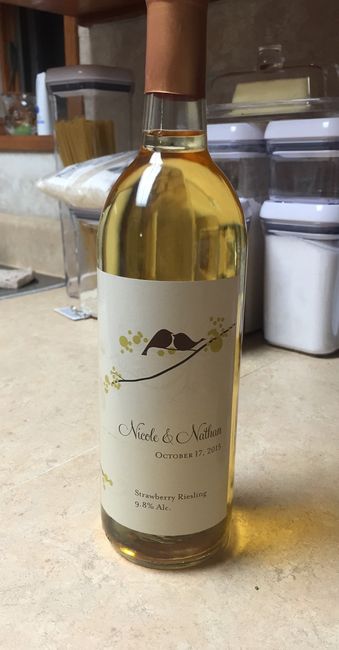 I'm so excited that our favors are done, and I just had to share!! My brother makes wine, and he offered to make it when we first got engaged. He made strawberry Riesling. We bottled it, put the foils on, put the labels on, and escort tags (not...
