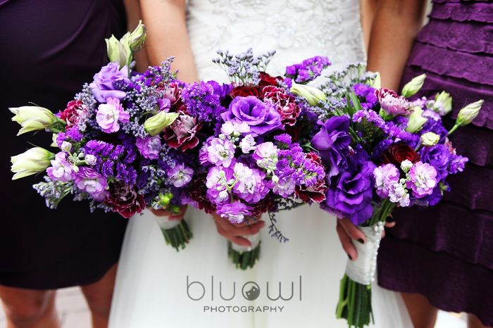 I was thinking purple flowers but I dont want to overdue it on purple- maybe orange roses? If anybody can find pics of bouquets with dark purple dresses please post them! I appreciate it!