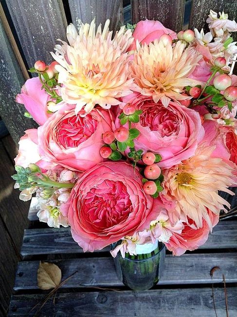 I'm DIYing my centerpieces and bouquets, should I use the same flowers in each or mix it up a bit? The flowers are going in mason jars for the centerpieces. Right now I'm doing pink carnations, peach rose buds, fushia open roses and pink sweet peas...