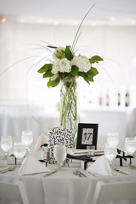 I am doing a black and white themed wedding. I bought some silk flowers half off at Hobby Lobby. I will be doing white hydrangeas for the bouquets and my bridesmaids will have black sating dresses. So i made a centerpiece with some silk hydrangeas...