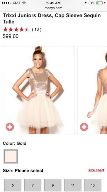 So my flower girls are older (~12) and I have been informed that one of them no longer fits a size 16 and now wears an adult small. I already had a dress picked out, but now I will have to pick a different one. I was really hoping for a gold dress,...