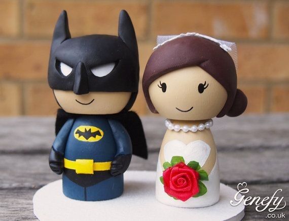 FH and I found a cute cake topper we liked, but it was super expensive. So, I asked my uber artistic cousin if she could make one inspired by it. She just finished and sent me pictures and it's so amazing! (FH is obsessed with Batman and I'm obsessed...