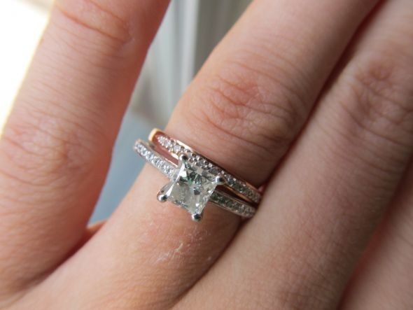 Do any of you have a gold wedding band and platinum (or white gold) engagement ring or vice versa? My engagement ring is platinum but I think I'd like to mix it up with a yellow gold wedding band. I don't like matching. Attached is a picture of the...