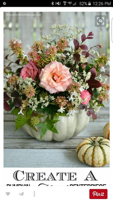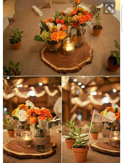 Need ideas for centerpieces for an October wedding. Not wanting mason jars since so many are using them. Any ideas appreciated. My colors are navy blue and permission(rustic orange)