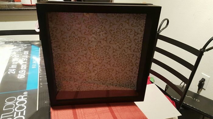 Another thing down! Ever since I saw a top-loading shadowbox used as a card box, I wanted to do it. Michael's had 40% off shadowboxes. I bought a pretty piece of scrapbook paper for the backing. Can't wait for my Etsy decal to get here.