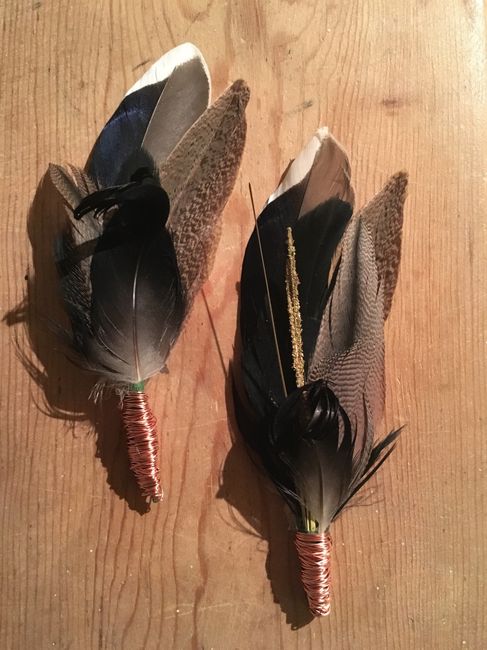 The boutonnieres I DIY'ed for the groomsmen. They are made from feathers from ducks FH hunted this past season! Show me some of your DIY projects! Did you guys decide to take on a lot or a little? I only have one DIY project left and that is doing...