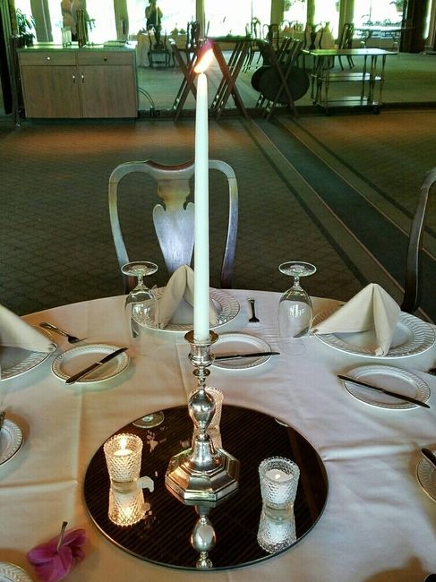 I had thought of doing upside glasses with flowers under them and candles on top. I tried it at my venue and really didn't like the look. Here's what they've tentatively worked up: round mirror with high candlestick holder and taper. Smaller candles...